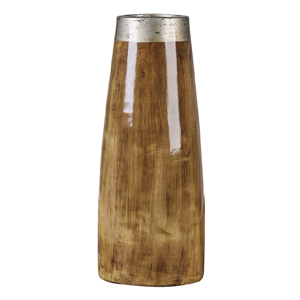 Rustieke Keramische Vaas met Houtlook Textuur - Zilveren Rand - Industriële Decoratieve Bloemenvaas